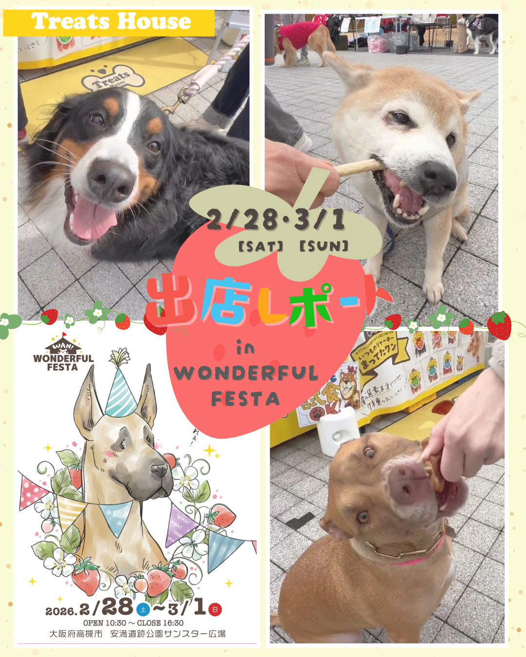 2月28日(土)・3月1日(日)の2日間、大阪府高槻市の安満遺跡公園で開催された「Wan! Wonderful Festa」に出店いたしました。 今回は「おっきい子集まれぇ!」のテーマ通り、中型犬・大型犬が主役のイベント🐾 1日目は「寒いですね〜!」と肩を寄せ合いましたが、2日目はうってかわってぽかぽかとした春の陽気に。大きなわんちゃんたちがのびのびと過ごし、飼い主さま同士も和やかに交流されている姿がとても印象的な2日間となりました。本日はその様子をレポートさせていただきます!